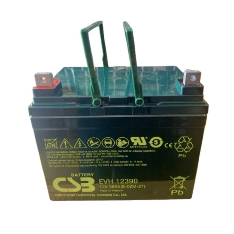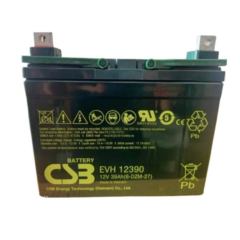 The CSB EVH12390 is a high-performance 12V, 39Ah valve-regulated lead-acid (VRLA) battery specially designed for high-cycle and deep-discharge applications. Featuring advanced Absorbent Glass Mat (AGM) technology, it delivers maintenance-free, leak-proof operation and excellent gas recombination efficiency for enhanced safety and reliability. With a long service life and the capability to provide hundreds of charge/discharge cycles, it is perfectly suited for use in mobility scooters, electric vehicles, renewable energy storage, UPS systems, telecom equipment, and emergency lighting. Its rugged construction, low self-discharge rate, and dependable performance across a wide range of environmental conditions make it an ideal power solution for both industrial and residential applications.